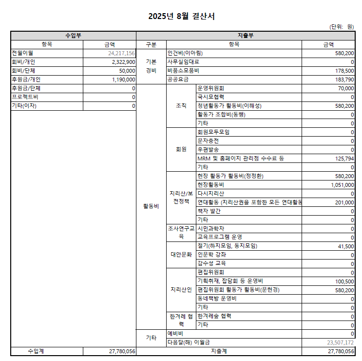 2025년 8월 결산 보고 에 의해서 지리산사람들 | 2025-09-03 | 결산보고 | 코멘트 0개 코멘트 제출 응답 취소이메일 주소는 공개되지 않습니다. 필수 필드는 *로 표시됩니다댓글 * 이름 * 이메일 * 웹사이트 다음 번 댓글 작성을 위해 이 브라우저에 이름, 이메일, 그리고 웹사이트를 저장합니다. Δ
