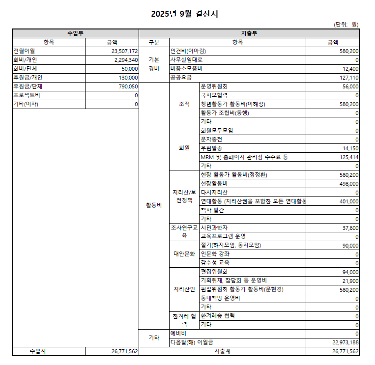 2025년 9월 결산 보고 에 의해서 지리산사람들 | 2025-10-11 | 결산보고 | 코멘트 0개 코멘트 제출 응답 취소이메일 주소는 공개되지 않습니다. 필수 필드는 *로 표시됩니다댓글 * 이름 * 이메일 * 웹사이트 다음 번 댓글 작성을 위해 이 브라우저에 이름, 이메일, 그리고 웹사이트를 저장합니다. Δ